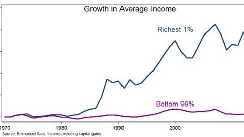 The chart shows that it is not just the 1% benefiting in this economy. It’s the top half of one percent. Even the super-rich are being left behind for the benefit of the uber-rich. So if the super-rich can’t even get a head in this economy, what does that say for the middle-class and underprivileged? Well, we know it doesn’t bode well for them and here is a chart to illustration what we already know – the uber-rich keep getting even uber-richer while the poor and middle-class are taking it on the chin.